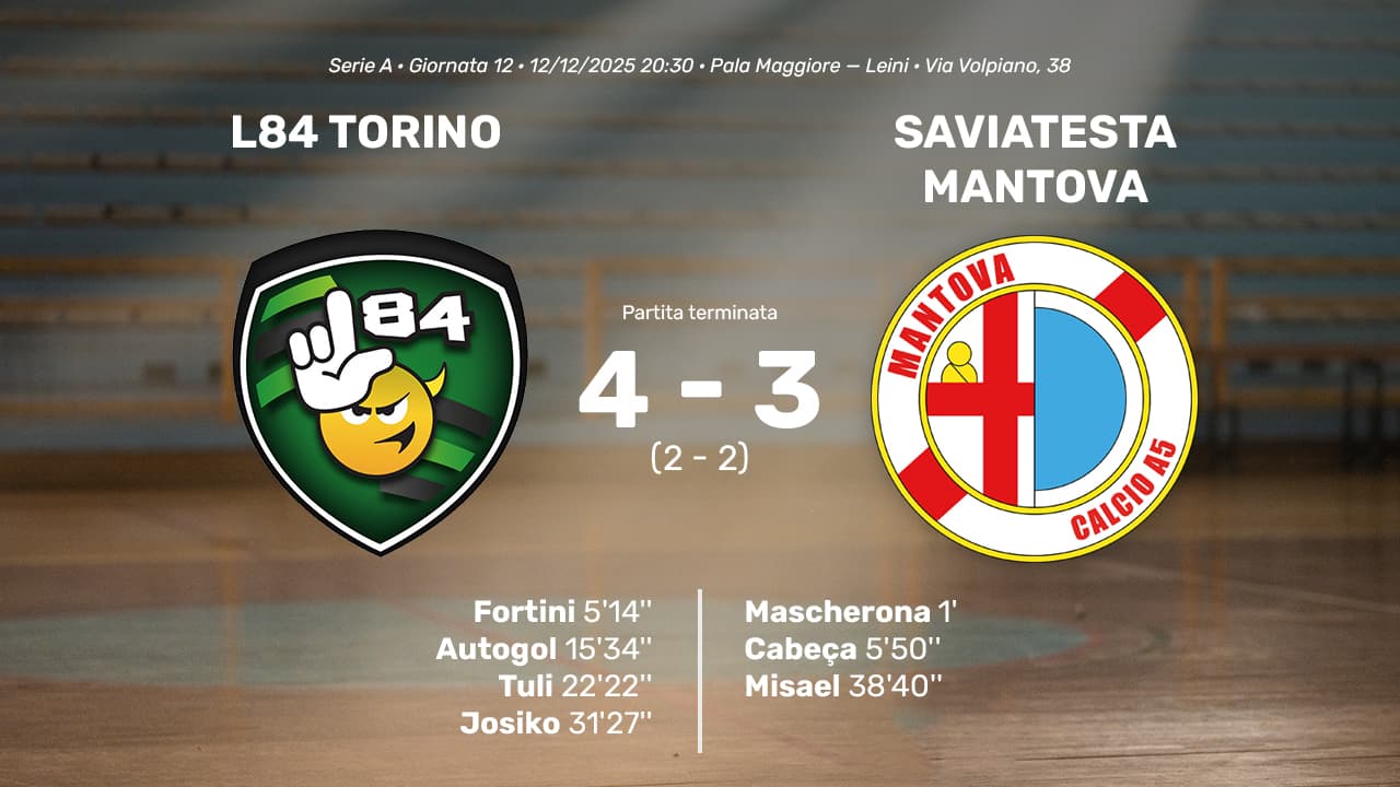 Un altro ko per il Saviatesta Mantova impegnato sul difficile campo dell’L84 Torino terza forza del massimo campionato di futsal. Prima frazione di gara iniziata col botto per i biancorossi, che dopo soli 30 secondi sono passati in vantaggio grazie ad una bella rete di Mascherona. I padroni di casa hanno reagito prontamente raggiungendo il pari...Read More